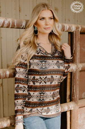 "Get twice the style with our Bison In Bandera Top! This reversible top features a brown and tan Aztec design on one side, and a cream-colored print with a bison, cacti, cowboy, and more on the other. Perfect for adding a fun, quirky touch to your ensemble." WILL START SHIPPING APPROX 2/9.