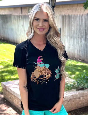 Show off your Wild West style with this COWBOY NATION TOP! It's the perfect combination of fringed, fabulous and fabulous-ly fringe-y. With an embroidered cowboy, bronco and a cactus, plus turquoise stitching on the sleeve, this top is sure to turn heads while y'all are out kickin' it!
