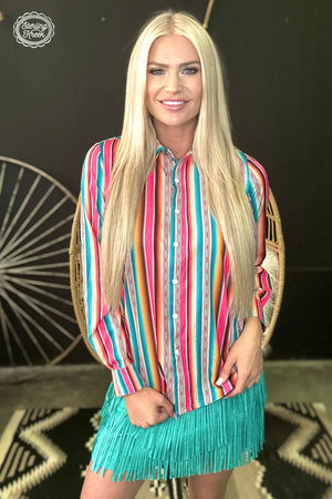 Live the life of a wild west saloon girl with this fashionable Feel The Sunset Top! It features classic serape-style buttons, ensuring you look as dashing as an outlaw. Show 'em you mean business - no deputy needed! 🤠