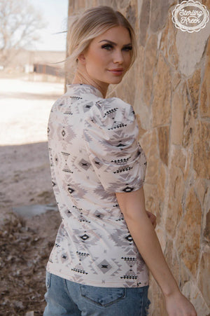 Stay on trend with our Aztec Canyon Top. This cream top features adorable short bubble sleeves and a unique gray aztec design. Perfect for adding a touch of quirkiness to any outfit.
