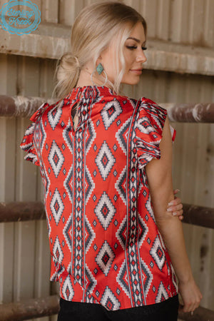 Get ready to turn heads in our silky red black and white aztec top, featuring a stretchy high neckline and playful ruffle short sleeves. Perfect for adding a pop of personality to any outfit. (Be warned, you may receive some major compliments!)