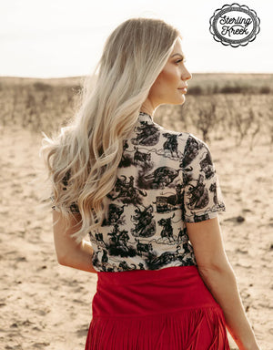 Saddle up with the Rodeo Road Top! This cream short sleeve mesh top features playful drawings of rodeo events. Perfect for adding a touch of quirk to your wardrobe, this top is as unique as it is stylish. Giddy up and add it to your closet today!