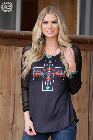 Shake up your style with the SAGEBRUSH HAVEN TOP. Black mesh sleeves and a razor back cut add a touch of edge, while the silky black top features a cross aztec design for a bold look. Perfect for making a statement and staying cool in the summer heat.