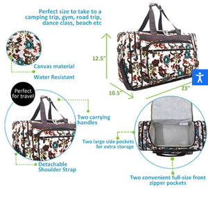 Made from canvas material. Duffel bag measures approx.: 23" x 10.5" x 12.5". Perfect size to take to a camping trip, gym, road trip, dance class, beach etc.