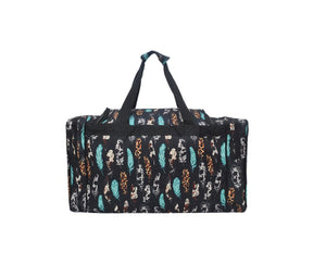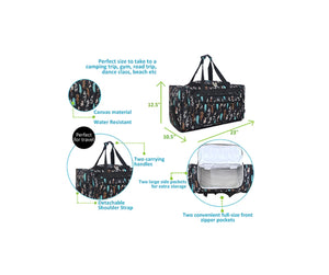Made from canvas material. Duffel bag measures approx.: 23" x 10.5" x 12.5". Perfect size to take to a camping trip, gym, road trip, dance class, beach etc.