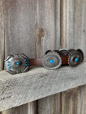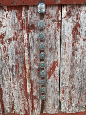 A silver & turquoise concho belt that is sure to be the finishing touch to your outfit. Two sizes with small/medium measuring 35”-37” at the shortest & longest holes. Medium/Large measuring 39”-41”. Conchos are screwed onto the belt but can be removed with extra space to punch holes. Leather is brown and buckle is sewn on but can be removed. Conchos are 2.5” x 2.25”. Belt weighs over 1lb so will ship priority mail for free.